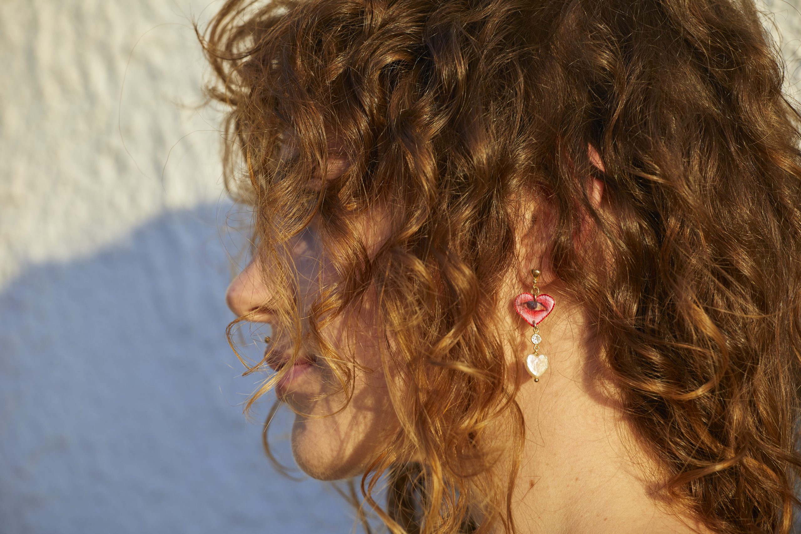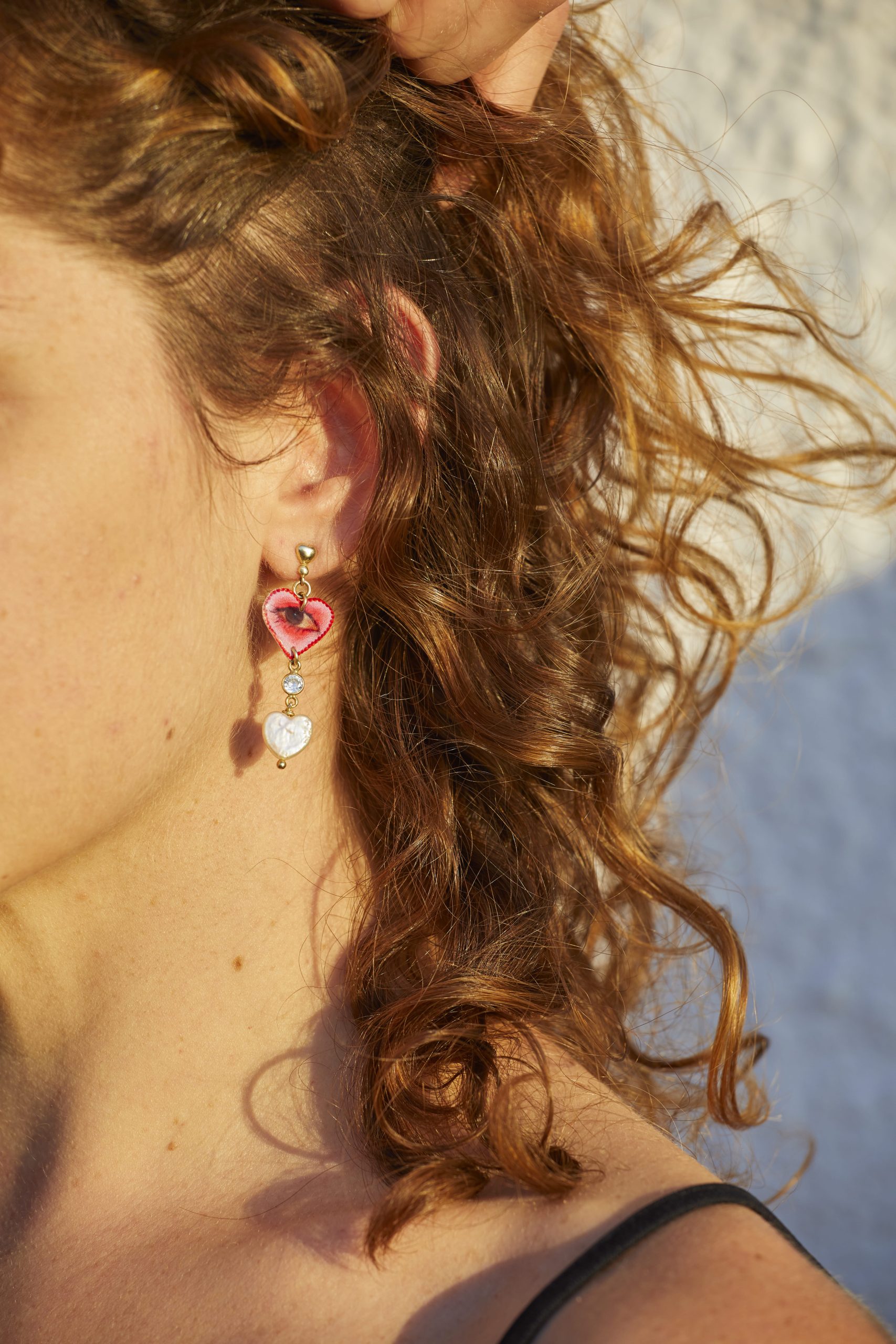 Materiales: Plata de ley 925 bañada en oro, impresión sobre plástico reciclado, resina UV, perla, circonita
